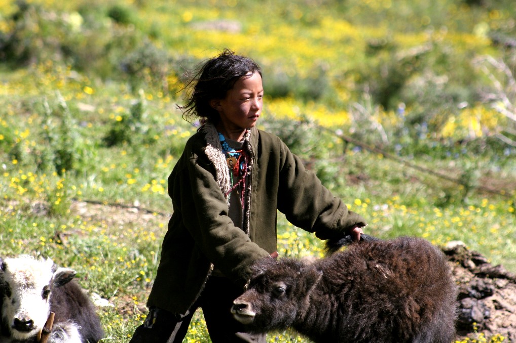 她脸颊有两块红得发黑的高原红, 黑红的脸庞和颈子上带的绿松石的鲜艳颜色形成了美丽的画面, 她的眼光述说着高原上的一切, 这个高原带给孩子们的是一种原始的苍野和自由, 她在一个陌生人面前, 展现了好奇和羞涩的交织, 她像一个藏族的小公主一样美丽动人, 她像一个幼小的精灵陪伴着这美如图画的山川和草地。