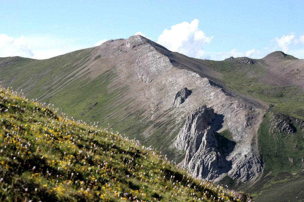 帐篷所在的这面山上, 是一个几乎望不到顶的大草坝, 大草坝的坡度非常陡, 爬上坡的顶段,才可以看到日加友山那红色的顶峰, 日加友的藏语意思是红色的山岩石, 这是一个古老的火山口, 千百年前, 火山爆发时, 将山的顶部的森林全部烧光, 所以上面再没有长出树来, 只有一望无际的青草和鲜花, 白天里, 小卓嘎就在这里的花丛中坐着, 看着山上的牛群, 她的妈妈和爸爸, 就在下面的森林里挖贝母和松茸。