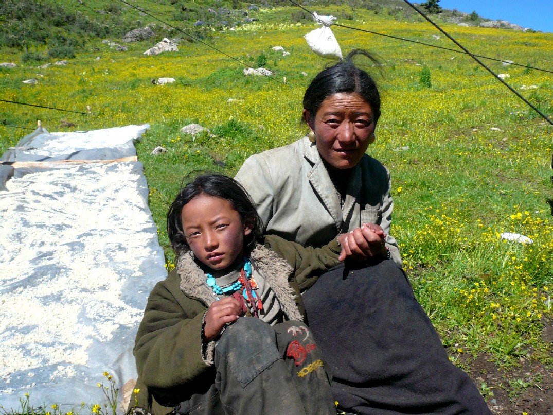 阳光下的母女,左边是卓嘎家晒的贝母。 |