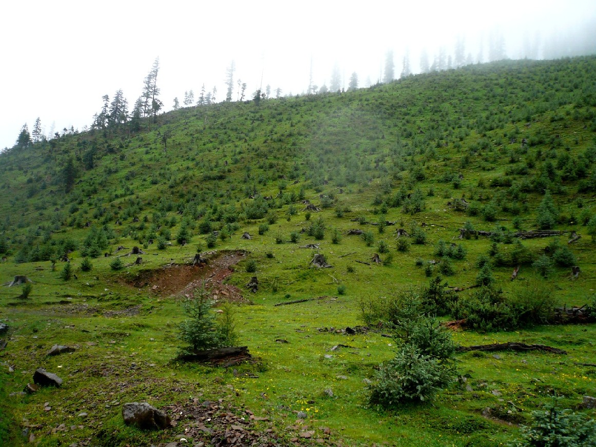 曾几何时, 在那疯狂的年代里, 有一个名不副实的与森林有关的单位, 美其名曰叫做森林工作什么的, 它的任务不是去保护森林, 反而是去人为的建造这样的祭场, 它先用飞机拍下所有的山沟, 然而派人进去计算可以砍伐的木材数量, 决定是否值得把路修进去, 把工棚修在山下, 它的所到之处,屠刀所向披靡, 森林惨遭屠杀, 民间人士痛骂它的三光政策, 森林砍光, 野兽杀光, 鱼类炸光, 三,四十年的浩劫下来, 高原上那连绵无边的森林, 被弄成了一片片光凸凸的荒山野岭。 现在这个单位虽然已经被取消了, 但它所带来的破坏, 还要延续起码一个世纪多, 被砍得稀疏的山林在猛烈的阳光下被晒得枝枯叶干, 地上的水分也无法保持, 因此经常引起巨大的山火, 被山火烧过的林子, 生态系统全部被破坏, 需要更长的时间恢复, 或者是永远没有办法恢复, 从事林业工作保护工作的人告诉我们, 在三四千米的高原上, 很多小树根本没有办法人为地去栽培, 过去的森林都是自然形成的, 它们一旦被砍伐, 就再也没有办法长出来。