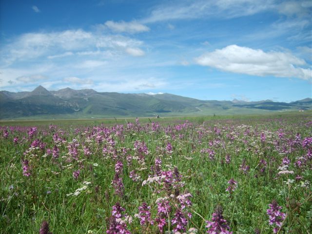 这张是在理塘县城的白塔公园后面照的,这个草场中间有很多紫红色的牧草花,其次就是有很多白的、黄的蒲公英。
