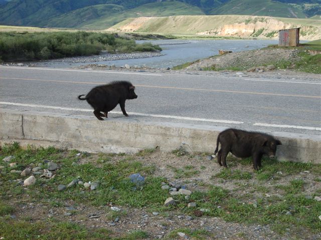 这张图片是我在雄霸乡下面的靠近无量河的雪鱼饭店旁照的,我酒喝多了点,坐在地上休息,看见有两头猪过来就顺手照了下来。这种猪的肉很鲜美哟~!