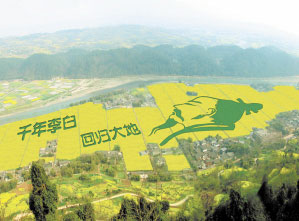 我国伟大诗人李白的故乡在四川绵阳江油。李白读书台位于江油太平镇,距江油6公里。读书台山顶距地面约600米,登山俯瞰,占地800亩的广袤田野尽收眼底。按艺术家们计划,在今年9月中旬油菜、小麦开始播种的时候,当地农民将按照事先规划好的形式在这800亩田野上播种。农民在播种的时候一律古装打扮,1800位身着古装的人组成大型方阵表演李白脸部形象,同时还可以变换成各种文字。
