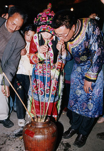 接着,新人为先辈点上一柱香,敬上一杯酒,以表达晚辈对先人的敬仰,祈求先辈的在天之灵保佑他们幸福平安。