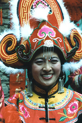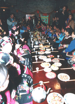 收到结婚请柬后,我们就开始筹划这次难得的参加羌族婚礼的机会。10月25日,由于在米亚罗拍摄红叶耽误了时间,刚到寨子口就听见寨子里响起了鞭炮声,寨子口几个羌家汉子看见我们,立即吹起了迎宾的唢呐,在小琼家门口,新郎倌还在等着我们。他们的婚礼吸引了来自全国各地的朋友和摄影爱好者。小琼家已被先到客人住满了,我们被安排到她亲戚周扬家。当我们来到寨子中心的小广场时,高音喇叭里正喊道:“参加龙小琼婚礼的客人请到礼堂用餐了”。原来我们已是第二批吃晚饭的客人了。礼堂里摆了二三十桌酒席,寨子里的亲朋和全国各地的来宾济济一堂。与我们同桌的有中央电视台、四川省和阿坝洲各新闻媒体的记者。四川画报社的老师也如约而至。饭菜虽没有城市酒店里那么丰盛,却有羌家独特的风味;自家酿造的咂酒虽没有五粮液名贵,却有着浓浓的清香。曾经多次给我们当过小模特的陈异雪和小姐妹们上菜、添饭、端盘、递碗,里里外外忙个不停。南腔北调的问候声、亲朋好友的敬酒声、孩子们的欢笑声、盘盏相交的脆响声,汇成了一首喜庆热闹、吉祥幸福的协奏曲。