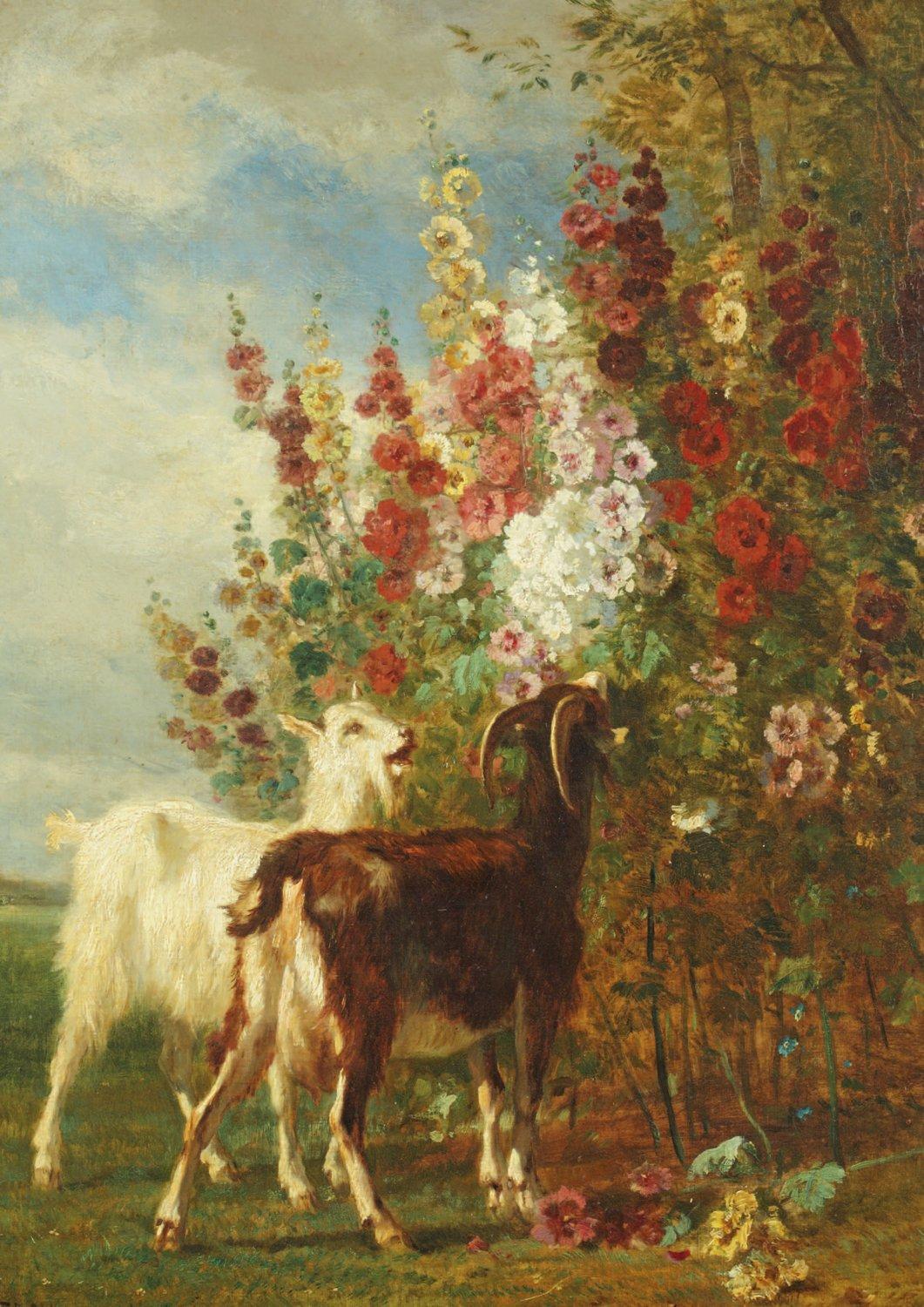 法国画家康斯坦·特罗雍(Constant Troyon,1810-1865)创作的《 Les chèvres dans les roses trémières 山羊和蜀葵》是他的代表作之一。