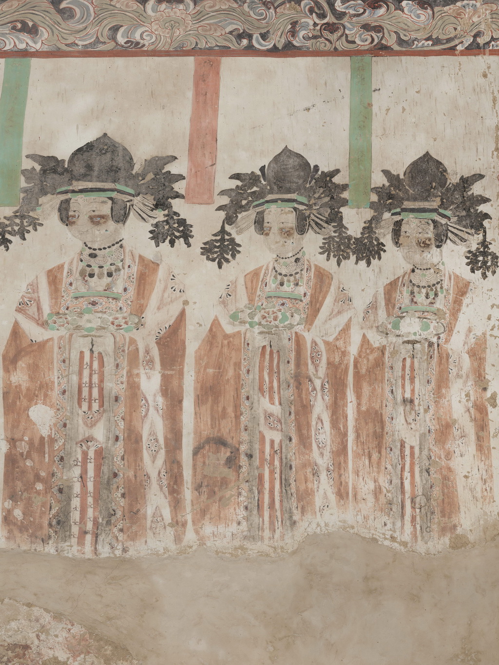 (本组壁画为敦煌莫高窟第61窟主室东壁供养人手托蜀葵花盘的图像)
