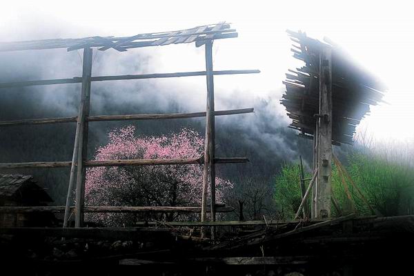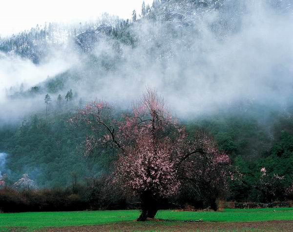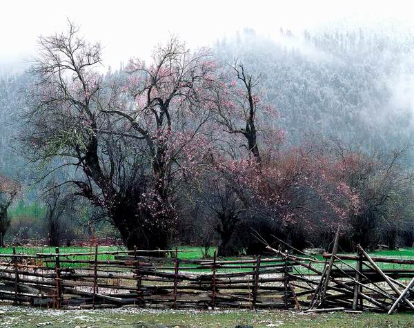 西藏的桃花就完全是两码事了,首先这些桃树不是人工培育优化后供观赏用的小树种,它们几乎都是大树,一个人抱的树是最常见的,二三人合抱的也屡见不鲜。桃树岂只是大而且还多,在田间、屋后、路边,随处能见到三三两两端立着,而在山坡上却常常是满山遍野,忽拉拉总有成千上万的感觉。以前听蒋大为唱《在那桃花盛开的地方》,总觉得会是在江南或中原某处常见的场景。的确,在素有西藏江南之称的波密、米林、朗县一带,那些桃林环抱的村庄,少有歌中所描绘的那种文人心中几乎已成模式的景色,那里所具有的,是真正属于西藏的、甚至带有些许欧洲苏格兰高地韵味的景象。就像所有的西藏风光与内地风光相比较最显著的差别一样,是大与小的根本区别。就算是一个普通的中景,画面中只有一棵桃树,但是远方高耸入云的雪峰就一定会让人产生博大的感觉。