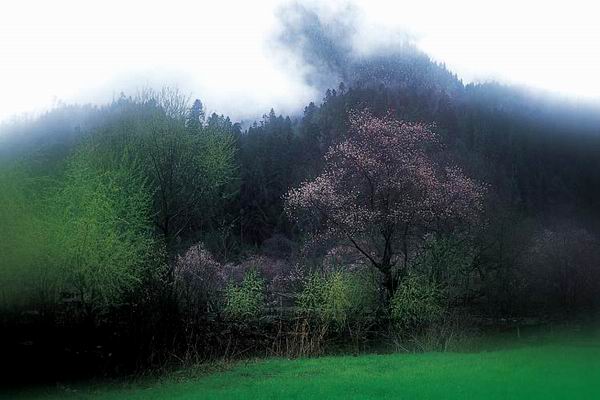 可是从波密向林芝,再从林芝沿雅鲁藏布转去米林县一带,这三县都属林芝地区。蓝天之下,碧水之畔,最最动人的又属桃花了。过去,在我的眼里,许多花是俗不可耐的,桃花则首当其冲。在我居住的杭州,西湖的白堤、苏堤等处,号称“一株桃花一株柳”,每到春天那些无型无款碧桃花爬满了枝干,春简直被过分装扮,可就是缺乏雅的感觉。