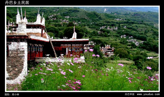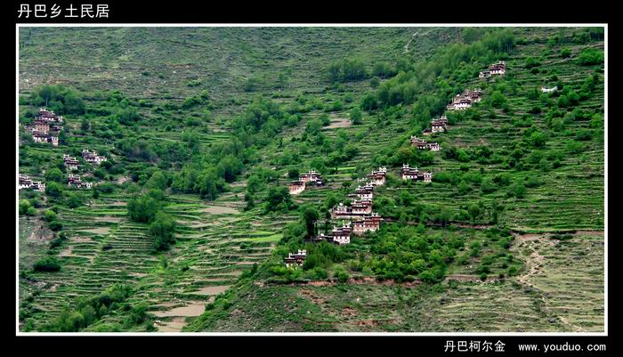 这是在横断山东部边缘丹巴县小金江的甲居村寨里。这里以矗立在小金江两岸错落有致、色彩缤纷、风格独特的嘉绒藏居著称。汽车从丹巴县出来,向小金江上游开了不到10公里,就到了甲居村所在山脚下。从左边上山,汽车绕过无穷多的“之”形山路,直到站在公路边向山下的深谷望得令人发晕,才终于到了我们的目的地。